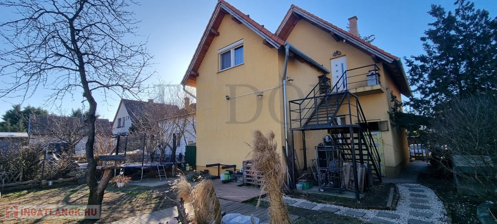 Telek és kert: A telek jelenleg osztatlan közös tulajdon, ügyvéd által ellenjegyzett telekhasználati megállapodással a házrészhez tartozó, privát 215 négyzetméteres telekterülettel. Az elválasztó kerítés kiépítése folyamatban van, a vételár részét képezi. A kert gondozott, WPC burkolatú sétáló- és kiülő résszel, halastóval, valamint több autó számára biztosított parkolási lehetőséggel. Az épület mellett fedett gépkocsibeálló is található.