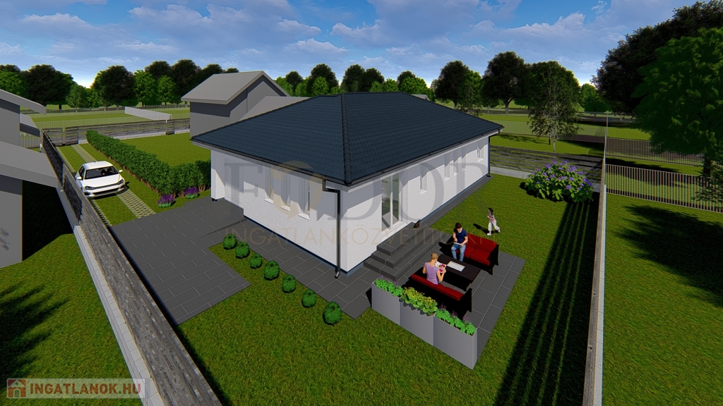 A ház hasznos lakóterülete 82,87 m2, a tágas amerikai konyhás nappali mellett 3 külön bejáratú hálószoba és egy fürdőszoba biztosítja a kényelmes, családbarát elrendezést. A ház a telek hátsó részén helyezkedik el, egy 3,35 méter széles, 24,73 méter hosszú nyélen, így átmenő forgalomtól mentes, teljesen privát területet biztosít a lakóknak. Az ingatlanhoz tartozó telek összesen 455 m2. Kertvárosi környezet, nyugodt, ahol a környéken kedves szomszédok és kiváló infrastruktúra várja a lakókat. Az ingatlanhoz 2-3 autó számára parkolóhely biztosított a telek belső területén, elektromos kapu és kiállás segíti a kényelmes bejárást. Az ingatlanok osztatlan közös tulajdonban kerülnek értékesítésre hivatalos ügyvéd által ellen jegyezve, telekhasználati megállapodással amik jogutódokra kiterjednek.