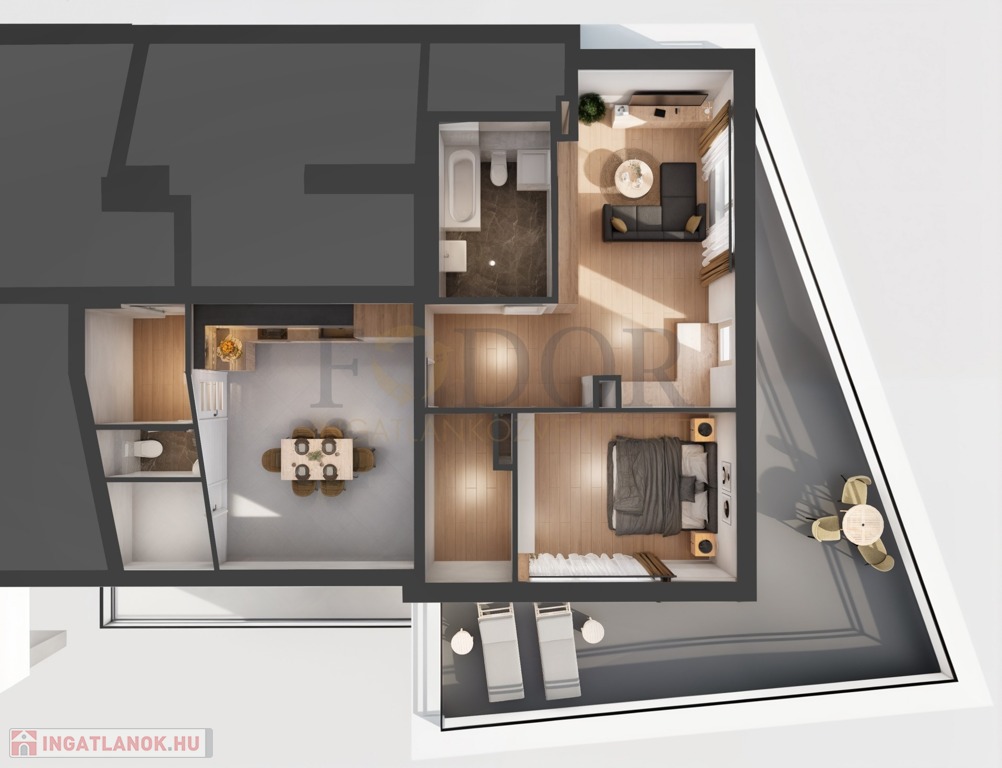 • 2 hálószoba + amerikai konyhás nappali